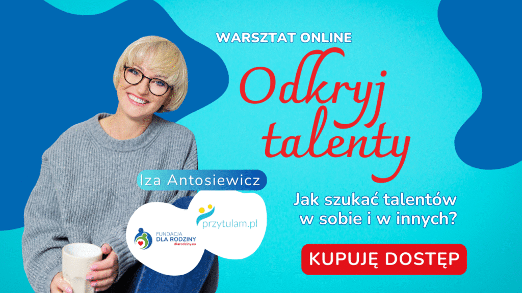 Nie czekaj, aż słabości Twoje lub Twojego dziecka same znikną. One nie znikną, ale mogą przestać być przeszkodą, gdy dacie dojść do głosu swoim talentom. Zachęcamy Cię do wykupienia dostępu do pełnego nagrania warsztatu z Izą Antosiewicz. To czas, który może zmienić atmosferę w Twoim domu na zawsze.